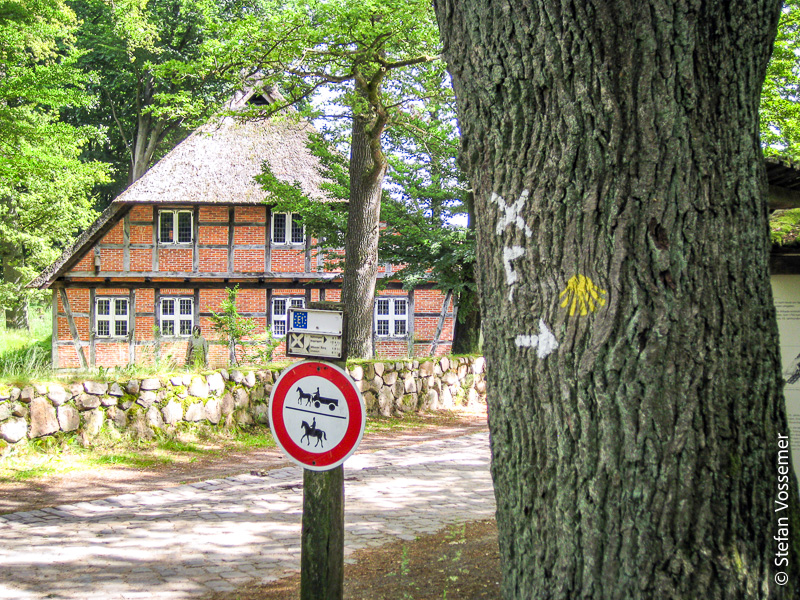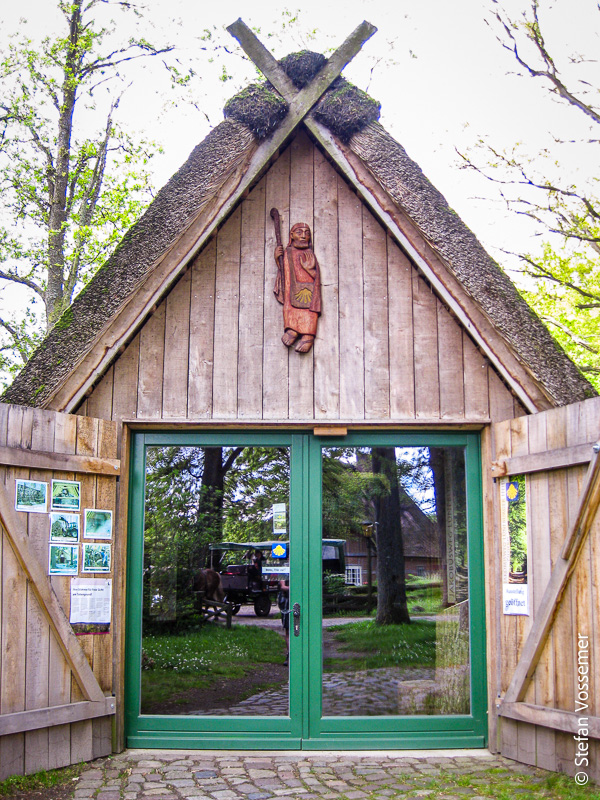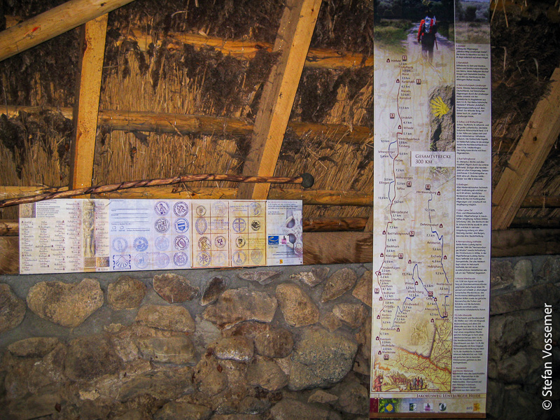Nach einigen Kilometern passiere ich Wilsede, einen kleinen, malerischen Ort inmitten der Heide. Auch hier gibt es einige Einkehrmöglichkeiten sowie eine kleine ausgebaute Scheune, in der sich eine kleine Ausstellung dem Jakobsweg widmet. Unter anderem liegt hier auch ein Stempel für den Pilgerpass aus, der mich schmerzlich daran erinnert, dass ich es bei den letzten beiden Unterkünften total versäumt habe, diesen dort zu kassieren. Ein Grund mehr, diesen in meinem Pass zu platzieren.
