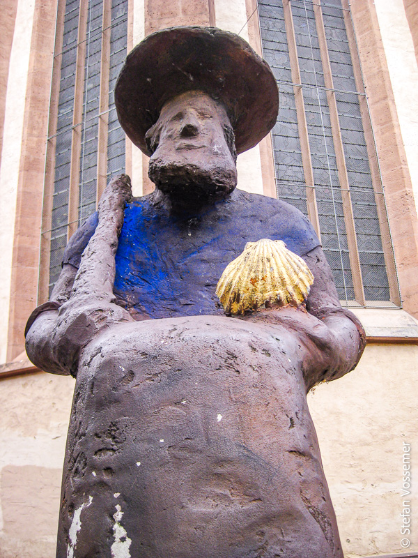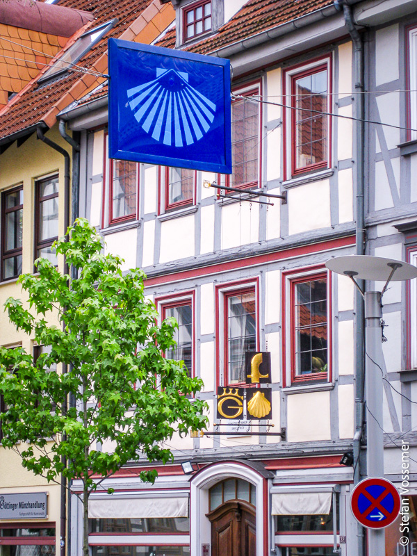 Als ich die Altstadt und damit auch die Jacobikirche erreiche, wird es wirklich kurios! Offenbar steht hier vieles im Zeichen des Jakobsweges. An den Häuserwänden hängen Schilder mit der Muschel, vor der Kirche sitzt eine steinerne Statue, die das Zeichen des Jakobsweges in den Händen hält, und auch vor dem Eingangsportal der Kirche ist eine riesige Jakobsmuschel in den Boden eingelassen (→ SV). Und da ich mir berechtigte Hoffnungen mache, dass der hiesige Pastor mir vielleicht ein paar mehr Informationen geben kann, warte ich geduldig seinen Gottesdienst ab. Das letzte Lied, ein Pilgerlied, widmet er dann sogar dem jungen Mann, der gerade von Hamburg nach Straßburg pilgert. Wir hatten kurz vor Beginn schon miteinander gesprochen. Aber als ich ihn im Anschluss interviewe, ist er nicht einmal in der Lage, mir den weiteren Verlauf des Weges hier durch Göttingen, geschweige denn darüber hinaus, zu zeigen! Das Gleiche gilt natürlich erst recht für eventuelle Unterkünfte im weiteren Verlauf. Dieselbe Erfahrung mache ich dann kurz darauf auch im Touri-Office. Die Frau am Tresen kann mir lediglich erzählen, dass hier häufiger mal Wanderer mit ähnlichen Fragen auftauchen. Nachfrage steigert hier offenbar nicht unbedingt das Angebot!