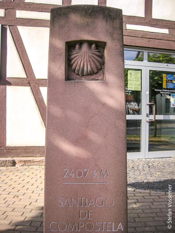 Vielleicht kann man mir hier ja ein wenig mehr zum Verlauf des Weges sagen. Also trete ich ein und treffe zunächst auf eine Frau, die mich direkt zum Büro des Pfarrers begleitet. Nach einem kurzen Gespräch mit ihm stellt sich heraus: Ja, der Camino verläuft hier durch den Ort. Allerdings nicht der, auf dessen Spuren ich unterwegs bin. Genau genommen ist es so, wie ich befürchtet habe: Zwischen Göttingen und Eisenach gibt es schlichtweg keinen Jakobsweg. Die Route, die hier verläuft, verbindet Leipzig mit Trier.