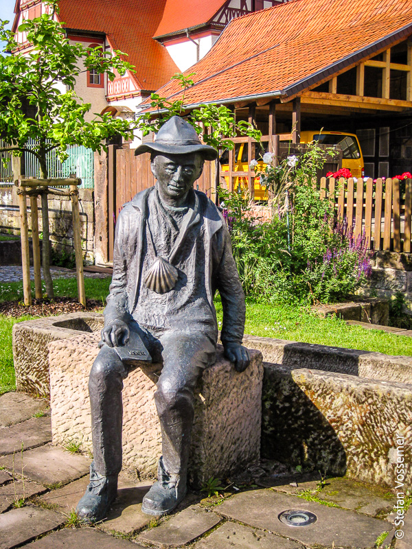 In dessen Zentrum entdecke ich plötzlich ein Pfarrhaus, das wieder einmal völlig im Zeichen des Jakobsweges zu stehen scheint. Vor dem Gebäude befinden sich diverse Symbole, eine Statue sowie Infotafeln.