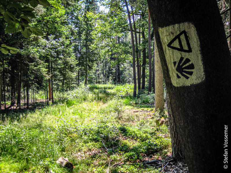 Die Sonne scheint wieder von einem wolkenfreien Himmel. Trotzdem ist es mit 15 °C noch relativ frisch, was sicherlich auch an der Höhe von rund 900 m liegen kann. Es dauert allerdings nicht lange, bis ich es sehr zu schätzen weiß, dass der heutige Abschnitt überwiegend durch schattige Wälder führt!